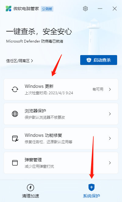 1、打开微软电脑管家,在主界面中我们切换至【系统保护】,选择其中的【Windows更新】;