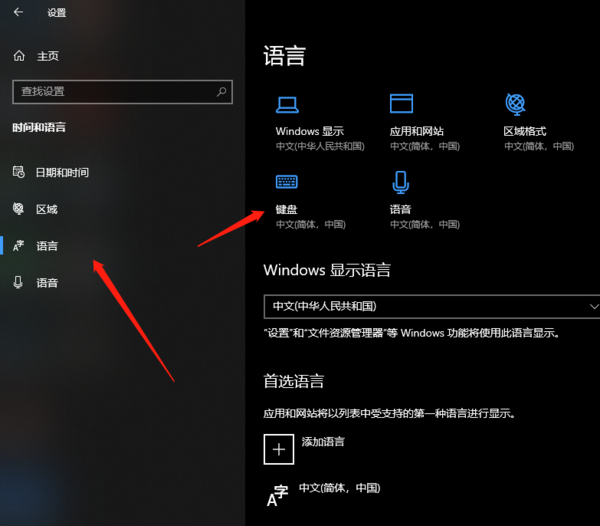 点击左侧【语言】分栏,找到【键盘】选项,点击进入;