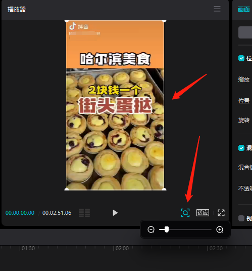 我们首先将需要去水印的素材导入到剪映中,在如图位置,我们点击【播放器】下方的【放大器】形状的按钮,在这里拖动进度条,调整到合适角度后,在通过拖动素材画面来调整位置,就可以让水印不再显示了。