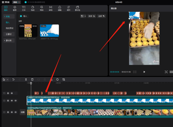 之后,拖动此素材到主轨视频上方,在【播放器】界面中将画中画素材调整到合适大小和位置,并将轨道中的画中画素材首位拖动到合适位置,使得把素材水印覆盖住即可。同样的道理,我们可以设置贴纸来遮挡水印。