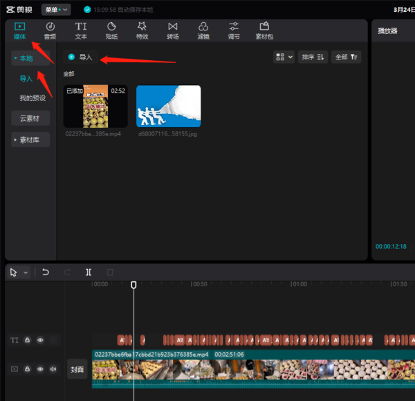 首先,点击左上角的【媒体】,找到【本地】---【导入】按钮,将需要作为画中画使用的素材上传进来;