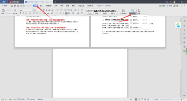 ①打开wps文档,然后点击【开始】菜单中的【查找替换】功能,然后选择【替换】功能。
