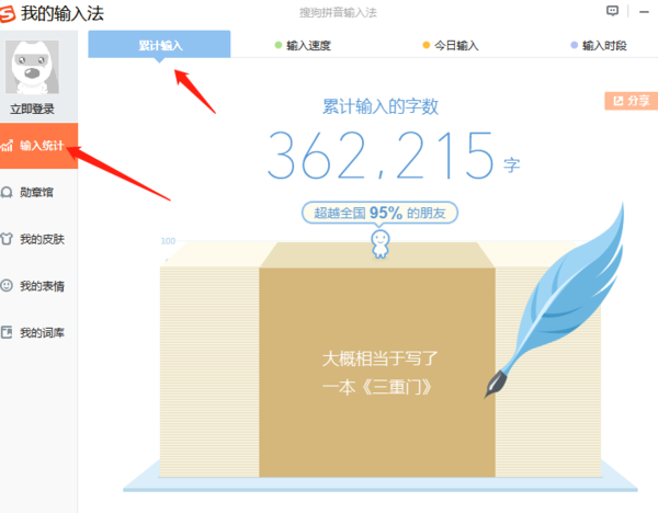 2、之后,会弹出【我的输入法】的窗口,点击左侧【输入统计】,即可看到累计输入的字数,并且大家无需登录账号就可以查看了。