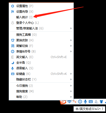 1、首先,按下键盘【ctrl+shitf】,将搜狗输入法窗口打开,右键单击输入法窗口,找到【输入统计】;