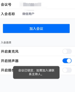 我们点击下方【邀请】按钮后,如图所示,被邀请人员就算通过复制邀请的方式入会,也会提示会议被锁定,无法进入会议。