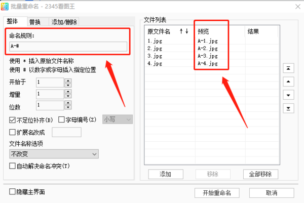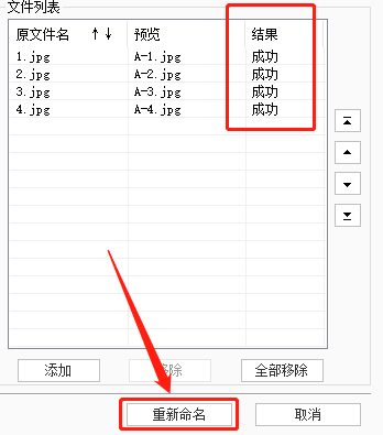 第四步:在右侧预览结果,没有问题的话,单击“开始重命名”就完成了。