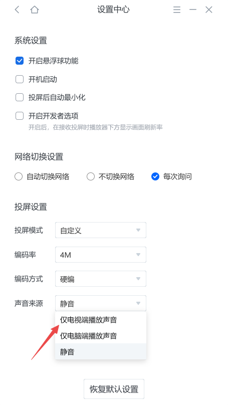 第二步,然后在界面的最底部,找到【声音来源】选项,这里我们选择【仅电视端播放声音】选项即可。