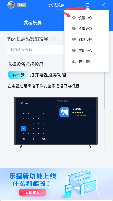 第一步,启动电脑端的乐播投屏软件,然后点击右上角的【三】图标,然后点击【设置中心】选项。