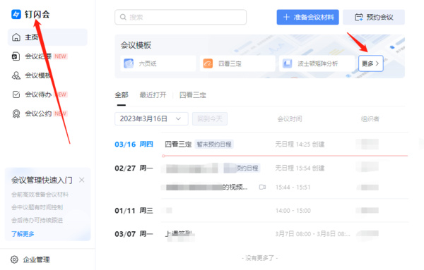 2、点击【钉闪会】中的【会议模板】更多选项;