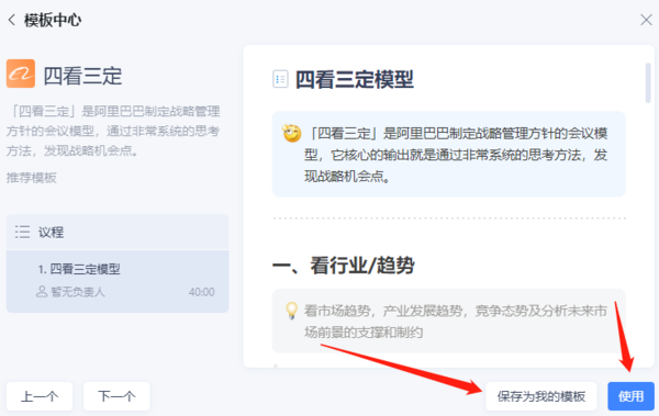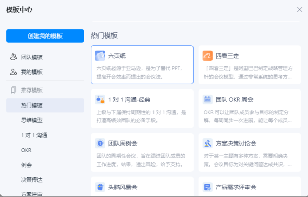 3、在这里看到很多现成的模板,还有许多经典的会议模板,像是【六页纸】、【四看三定】、【团队OKR周会】等等,我们可以找自己喜欢的模板来使用,也可以点击左上方按钮DIY自己的会议模板;