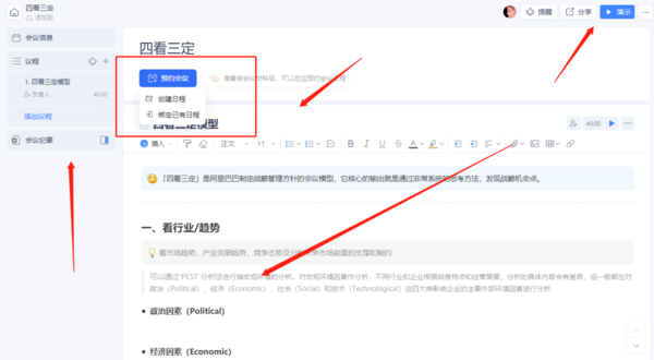 5、在这里,我们可以在线编辑会议模板,填写会议信息,设置议程、会议纪要等,并且可以实时演示,且我们制作好会议模板后,可以在【预约会议】中,创建到新的日程会议中,也可以绑定已有的日程,非常方便。