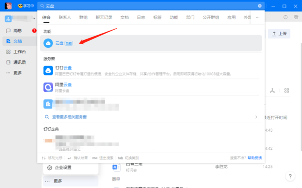 1、大家在钉钉界面上方搜索框中搜索【云盘】,或者在菜单页面找到【云盘】;