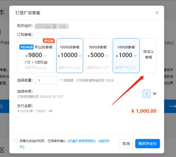 页面跳转后,来到扩容充值界面,我们选择需要的容量,确定好组织后购买即可,且我们还可以【自定义套餐】。