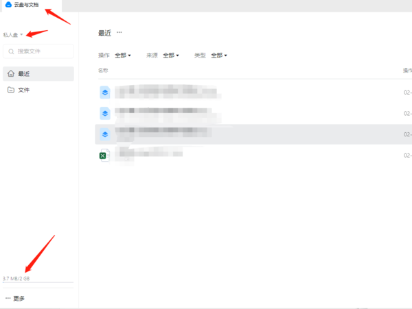 2、进入【云盘】的功能界面后,如图所示,映入眼帘的是我们的私人盘目前的状态,在左下角可以查看当前的存储空间用量;