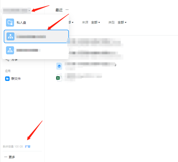 3、我们点击如图所示的下拉按钮,可以切换至企业或组织,也是在左下角查看当前存储空间用量。