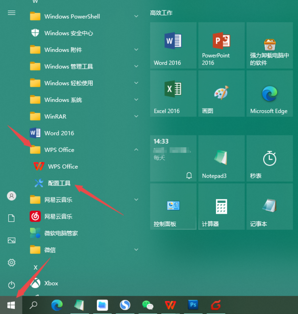 首先,打开电脑的【菜单】按钮,找到【WPS?Office】选项下的【配置工具】选项,并点击进入。