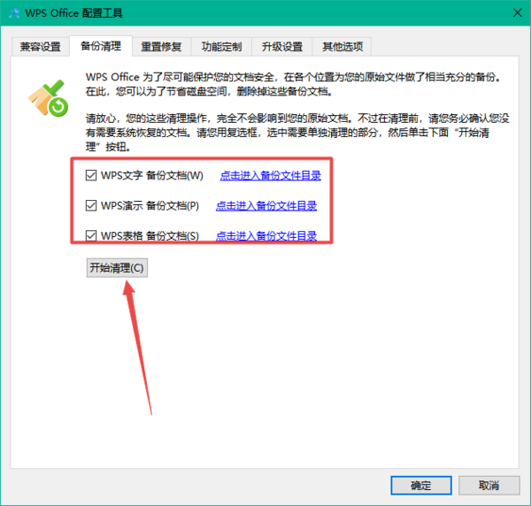 然后,点击【备份清理】选项,勾选所有,点击【开始清理】按钮,清理完成后,重启WPS,一般就可以解决问题。