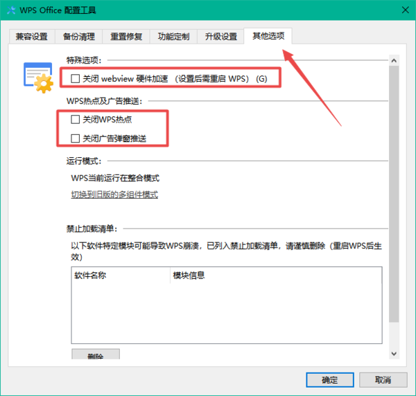 接着,选择【其他选项】,将【WPS热点】和【广告推送】等所有推荐功能关闭掉。