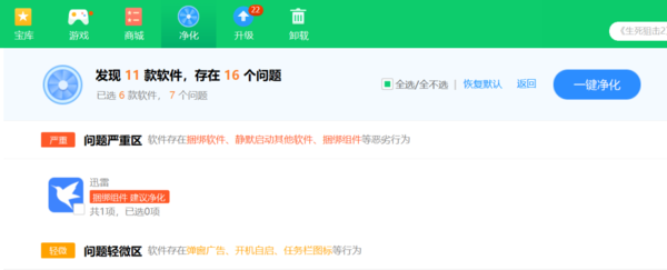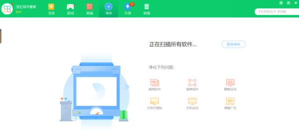 2、点击【全面净化】即可开始让360软件管家一键全面检索电脑中所有的有害捆绑软件、组件。
