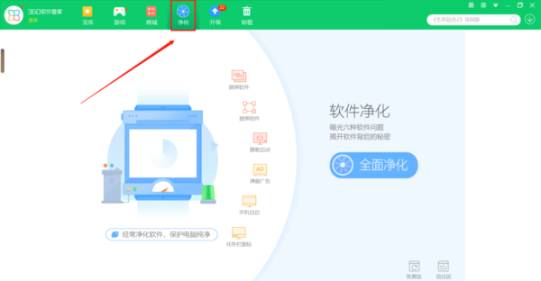 1、我们下载并打开360软件管家,在上方菜单栏内找到【净化】功能。
