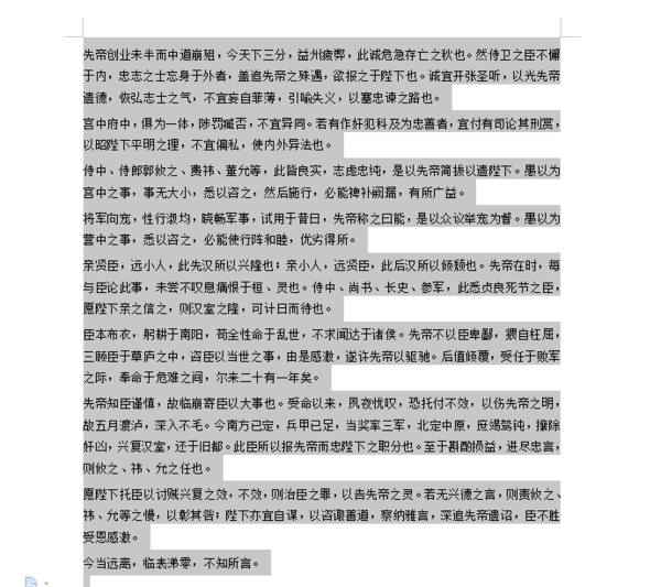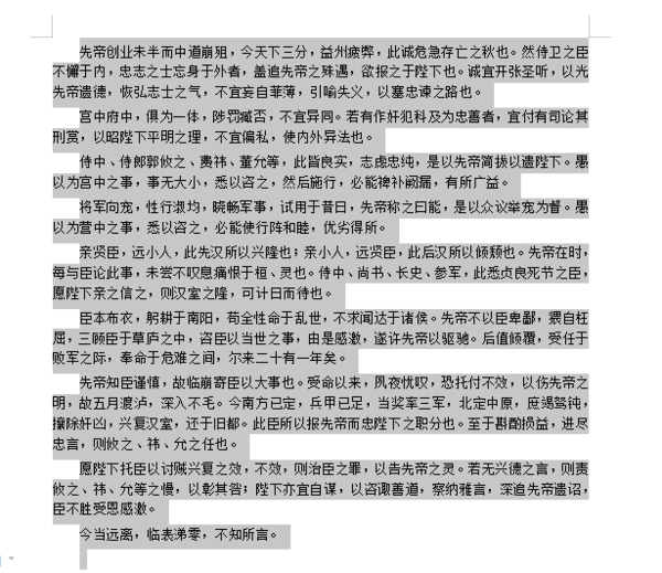 1、如图所示,小编这里有一篇段落格式并不整齐的出师表,首先我们按下【ctrl+A】或者鼠标拖拽,将文章内容全部选择;