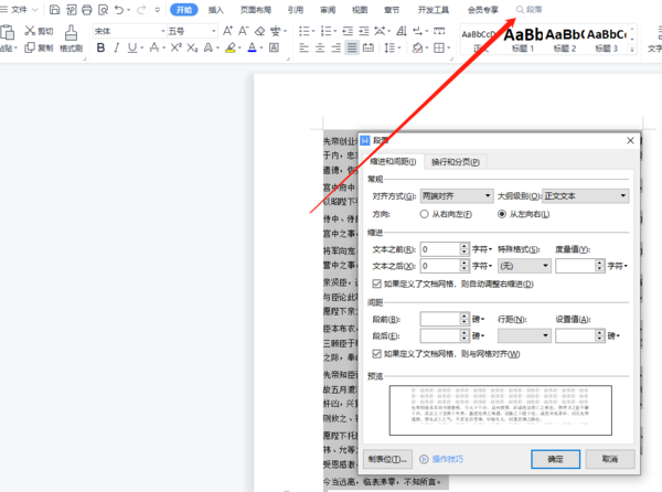 2、之后,在上方菜单栏中找到或者搜索【段落】功能并点开【段落】的设置窗口;