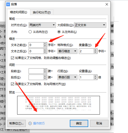 3、之后,在【缩进】栏中选择【首行缩进】并设置【2字符】;在【间距】栏中选择【单倍行距】并设置【1倍】,大家可以根据自己的想法进行选择,且大家可以在下方【预览】处查看设置之后的效果;