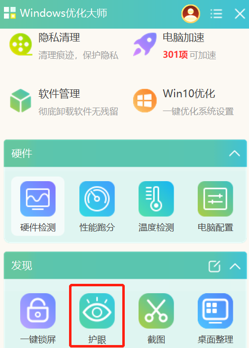 1、打开Windows优化大师主界面的【发现】——【护眼】。