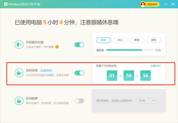 3、定时休息功能可以让我们自定义使用电脑的时间,设定时间即将到达后,Windows优化大师会进行系统提示,用户可以让眼部进行放松,起到护眼效果。