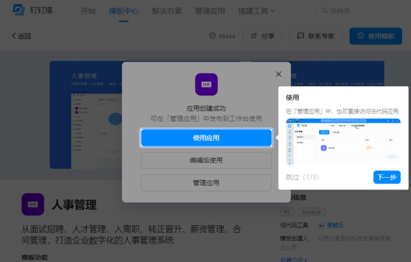 1.?我们拿【人事管理】板块举例子,首先点击右上角【使用模板】,并选择【开通应用】;