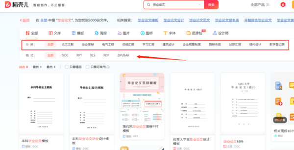 3、如图,我们可以搜出超多的毕业论文模板,和网络上那些大家都在用的模板都不一样,极具创新,起到了降重的作用,且我们可以选择分类,如电气工程、毕业答辩、总结汇报等等,以及各种文件格式,大学生毕业涉及到的这里都可以搜到;