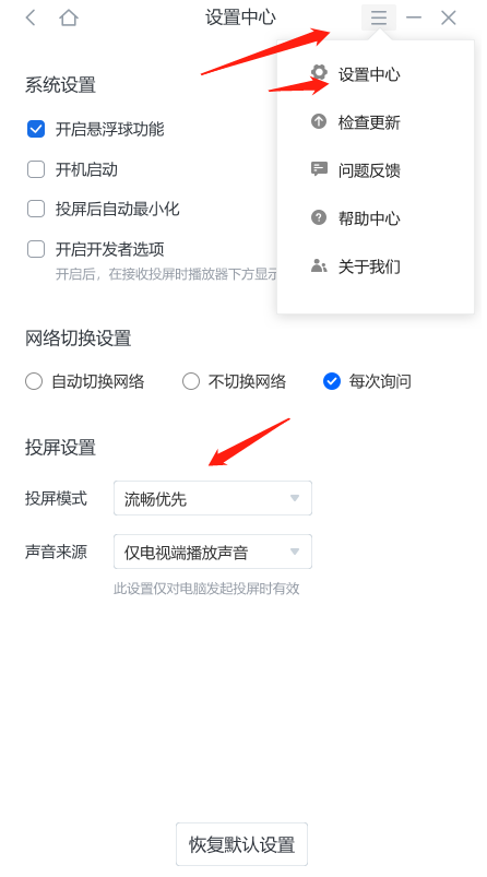3、进入【设置中心】,设置选择好【投屏模式】、【声音来源】等等;