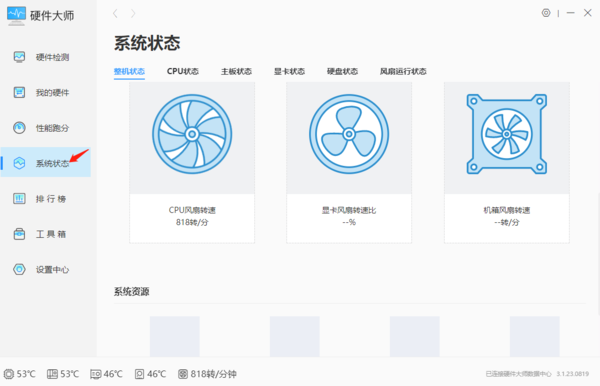 同样地,我们还是在Windows优化大师电脑跑分的界面,只不过我们需要点击左侧【系统状态】,就可以切换到Windows优化大师系统查看界面,在此可以了解风扇转速、系统资源使用占比等属性,届时我们可以决定是否关闭一些软件来规避异常,或是对一些硬件进行检修。