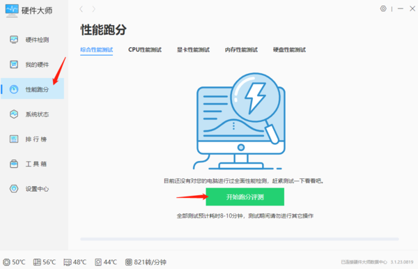 ②然后,在界面中,我们先点击左侧【性能跑分】;再点击【开始跑分评测】。(注:这里以综合性能测试为例,如果我们仅想单独测试显卡、CPU等,可以选择对应的性能测试。)