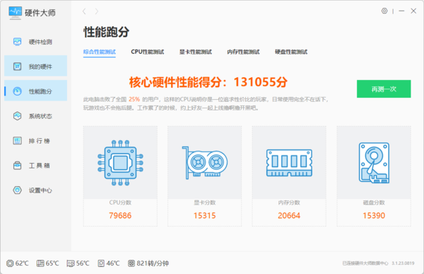 ④测试之后,我们可以得到电脑跑分测试分数,其中包括总分,以及每个硬件的分数,这样我们可以非常直观地了解自己电脑的硬件情况;如果想升级硬件,也可以更有针对性地升级。