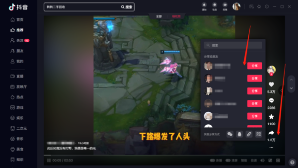 可以,在抖音电脑版中刷视频的按键其实是一样的,如图,我们可以点击【箭头】按钮进行转发,同样可以转发给QQ或者微信的好友等等,且可以看到,这里的操作其实和手机上的抖音是一样的,也可以点赞评论收藏等,并没有复杂化。