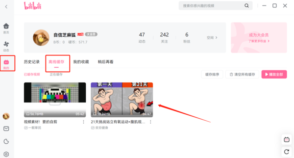 3、在哔哩哔哩客户端的主界面【我的】——【离线缓存】——【已缓存视频】中即可找到我们刚刚缓存的视频。