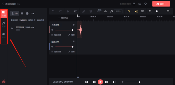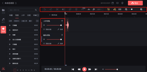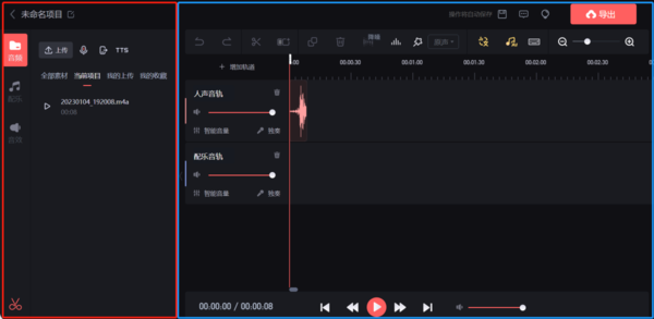 在右侧的剪辑区域,分为两段音轨:人声和配乐,满足了音频剪辑的基本需求,可以将二者进行分割、淡入淡出、降噪、音色调整。
