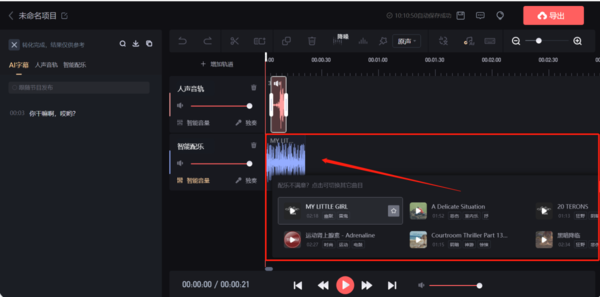 云剪辑会通过AI分析背景音乐的音轨声波图,并自动从配乐素材库中抽取一部分符合该背景音乐的曲子,让用户自行试听和选择,非常的人性化。