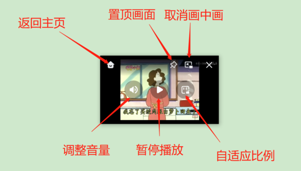 在画中画模式下,我们可以看到缩放的画面上有多个按钮,这些按钮都是什么意思呢?一起来看看吧~