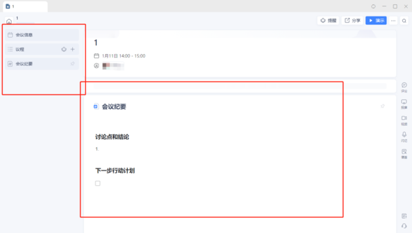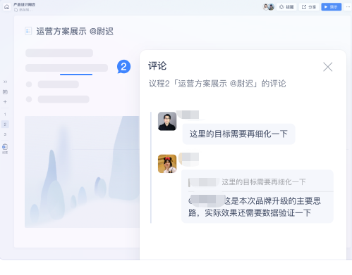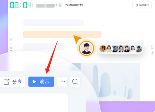 6.?会中我们可以点击右上角的【演示】按钮,全屏沉浸内容,参会者会自动跟随,围绕演示视角,聚焦问题,深度讨论。