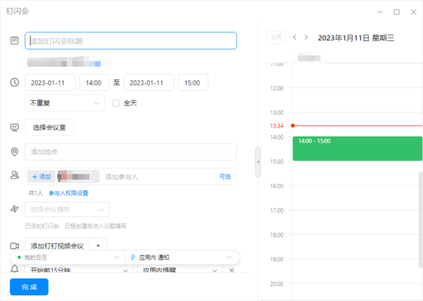 2.?在弹出的【钉闪会】设置窗口中,我们需要添加钉闪会的标题、时间、选址、参会人等等,直接将会议的起止、主题一步落实到位,将会议整体框架进行搭建;
