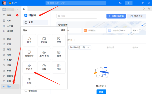 1.?在钉钉电脑版中,我们点击左侧【更多】,找到其中的【钉闪会】,点击【创建】按钮;