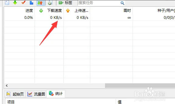 2.?之后,进入比特彗星的下载资源界面,我们可以看到下载速度为0,证明端口阻塞;