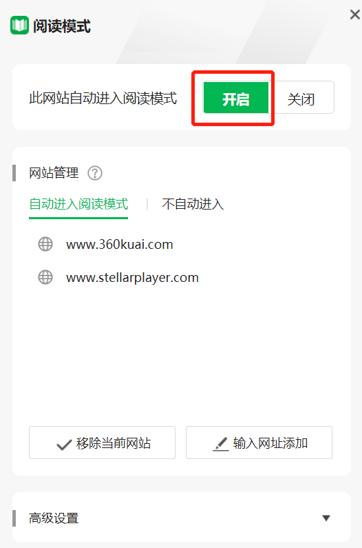 3、在弹出的阅读模式设置菜单栏内,找到此网站自动进入阅读模式的【开启】并点击。