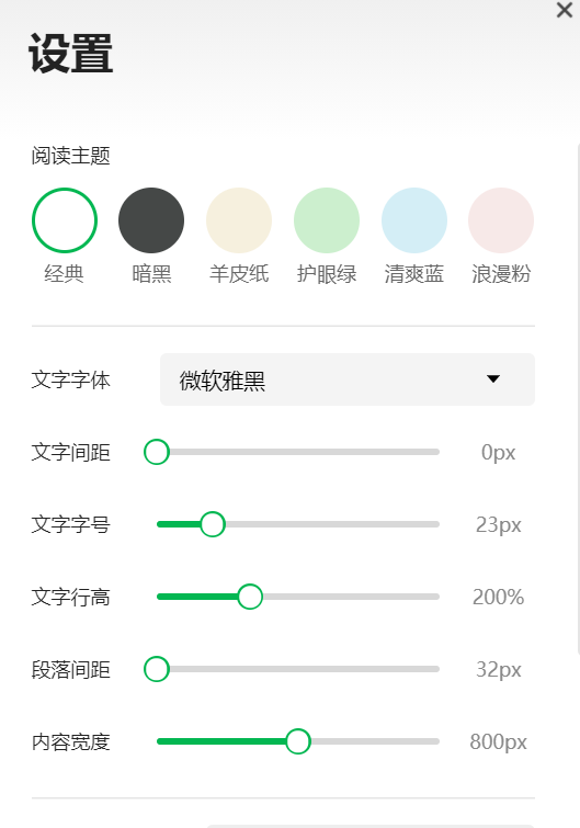 设置:可以调整背景颜色、字体样式、字体大小、字体间距、段落行高等排版,优化阅读。