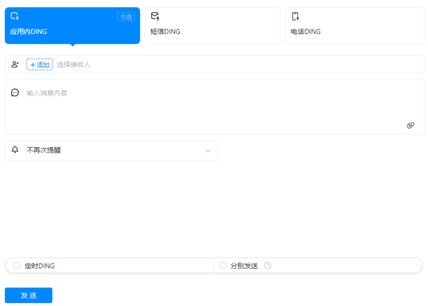 我们可以在应用内DING界面中,点击添加接收人、信息内容,以及提醒频率,在这些都编辑完后,点击【发送】即可发送至他人。