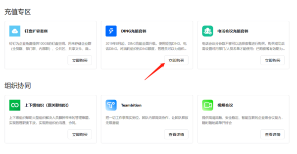之后,我们跳转网页,在【充值专区】中找到【DING充值套餐】,再点击【立即购买】。