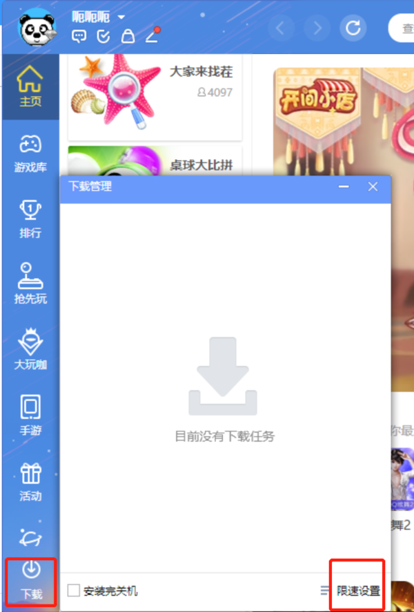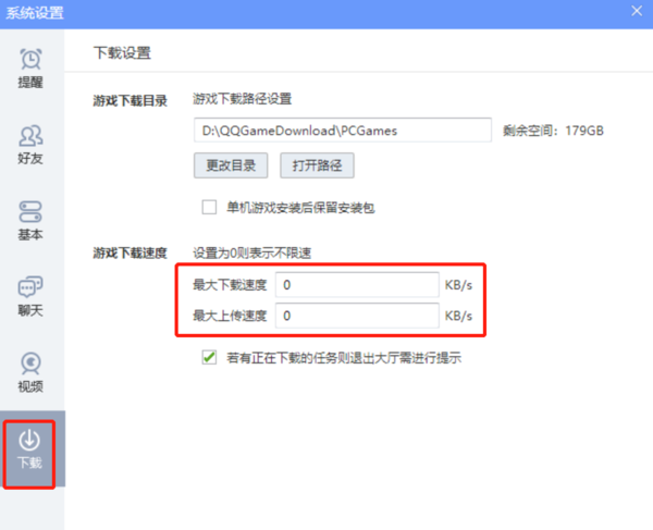 2、之后在弹出的设置菜单中找到【下载】——【游戏下载速度】,将最大下载速度和最大上传速度皆设置为0。