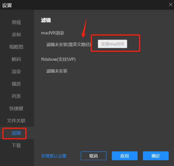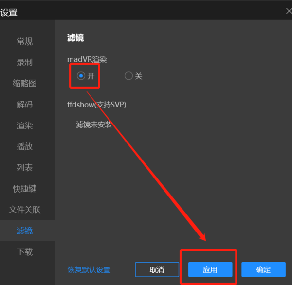 4、安装成功后我们再回到【滤镜】菜单栏中既可开启madVR,最后点击【应用】——【确认】即可安装成功了。